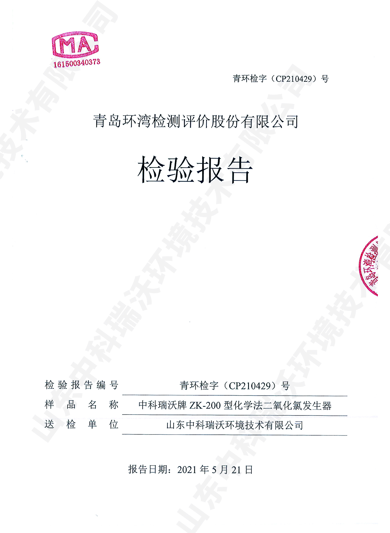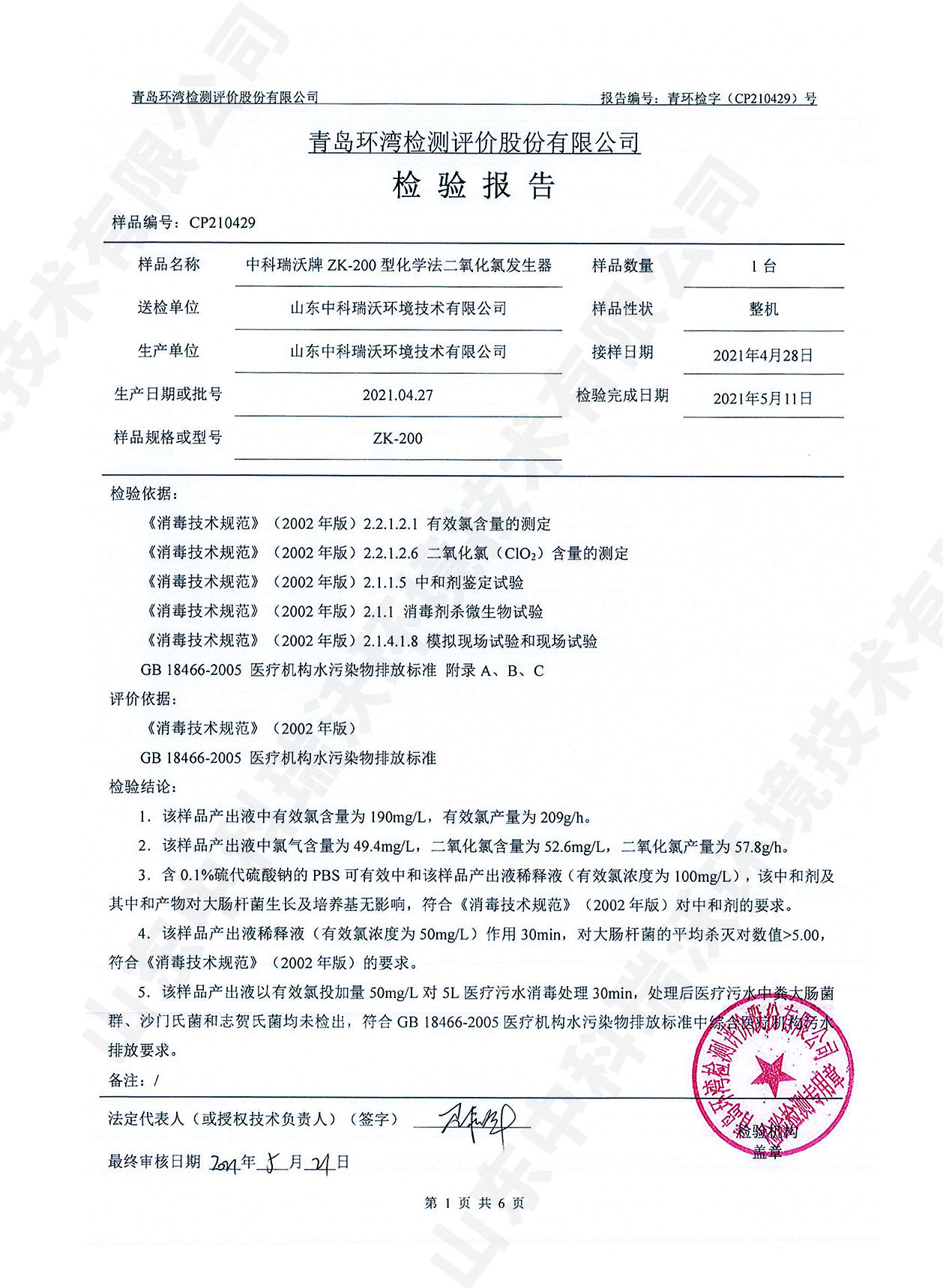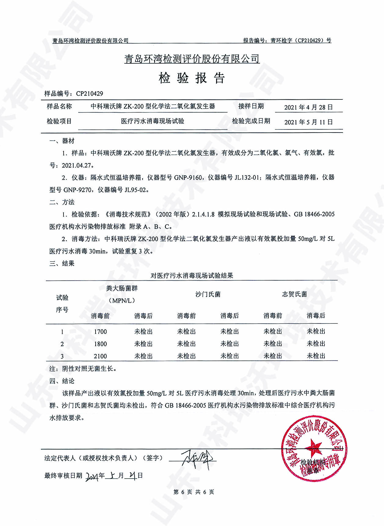 醫(yī)療污水處理設(shè)備檢測(cè)報(bào)告~二氧化氯消毒
